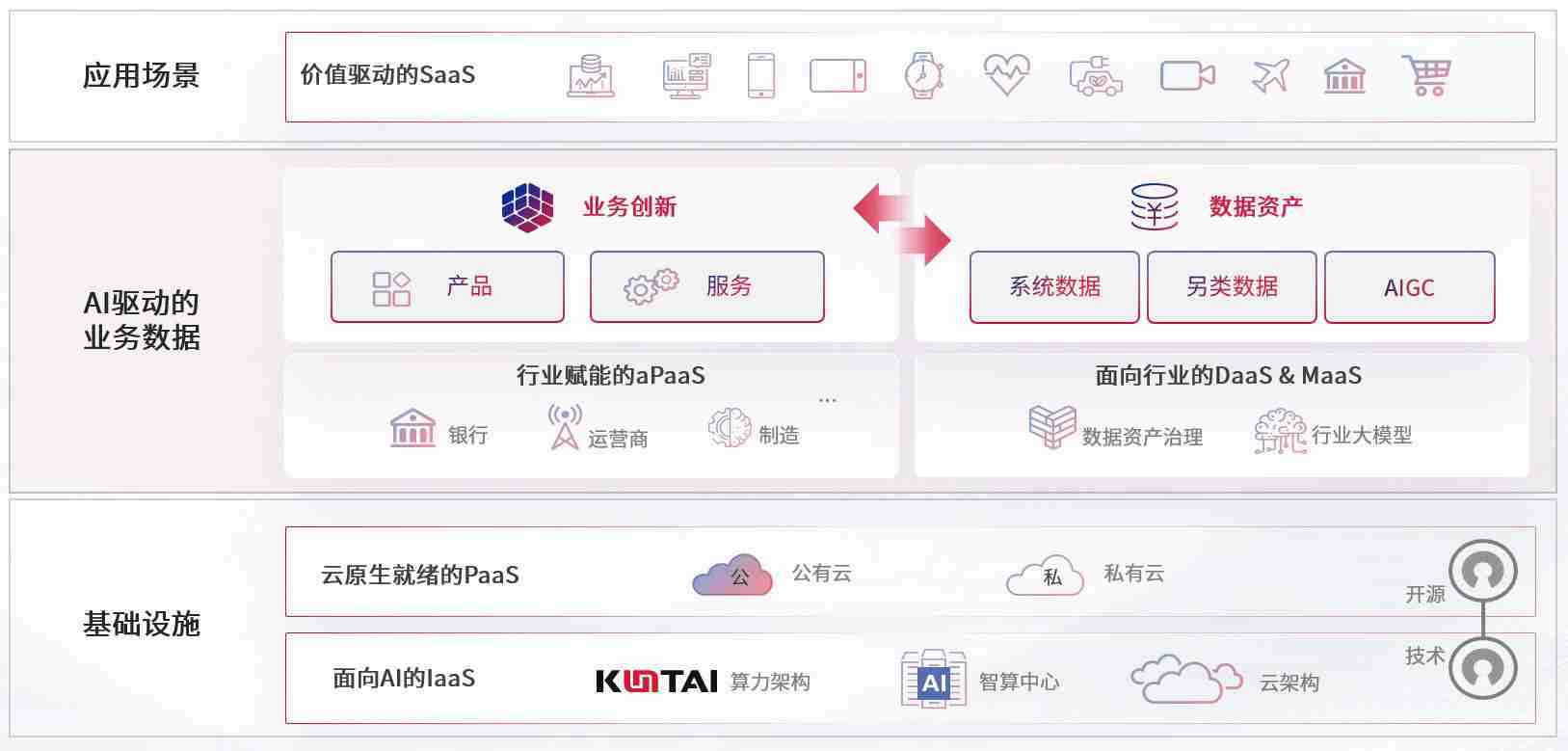 数字时代,,围绕企业数字化转型的关键要素,,,,98858vip威尼斯游戏数码开创性的提出数云融合战略和技术体系框架,,,,着力在云原生、、、、数字原生、、AI原生和信创产业上架构产品和服务能力,,,为处在不同数字化转型阶段的快消零售、、、汽车、、、、金融、、、医疗、、、、政企、、、、教育、、、运营商等行业客户提供泛在的敏捷IT能力和融合的数据驱动能力,,构建跨界融合创新的数字业务场景和新业务模式,,,,助力企业级客户建立面向未来的核心能力和竞争优势,,,全面推动社会的数字化、、、智能化转型升级。。